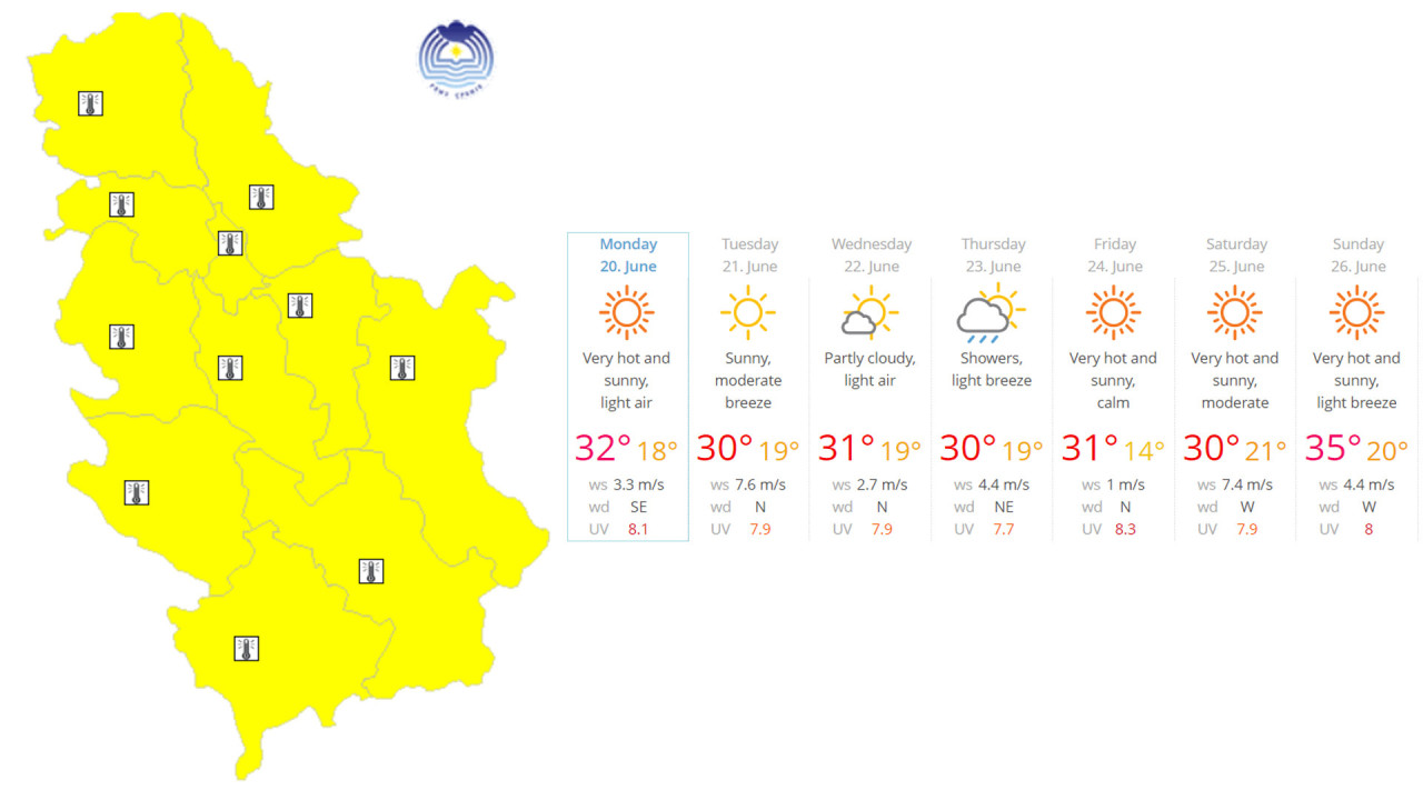 U periodu od 27.06. do 3.07. u većem delu Srbije predviđa se da će srednje nedeljne temperature vazduha biti iznad višegodišnjeg. Istovremeno, u većem delu Srbije nedeljne količine padavina biće ispod, a u slivovima srednjeg i donjeg toka Južne Morave će se zadržavati u granicama višegodišnjeg proseka. Dakle, u većem delu Srbije biće toplije i suvlje, a u slivovima donjeg i srednjeg toka Južne Morave toplije i prosečno vlažno vreme za ovo doba godine. Početkom perioda jutanja temperatura vazduha imaće vrednosti u intervalu od 19°C do 22°C, a najviše dnevne od 32°C do 36°C. Zatim će jutanje temperature vazduha biti u intervalu od 16°C do 19°C, a najviše dnevne od 27°C do 31°C. U većem delu Srbije nedeljna suma padavina biće u intervalu od od 5 mm do 15 mm, u brdovito-planinskim predelima lokalno i do 35 mm.