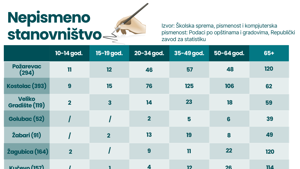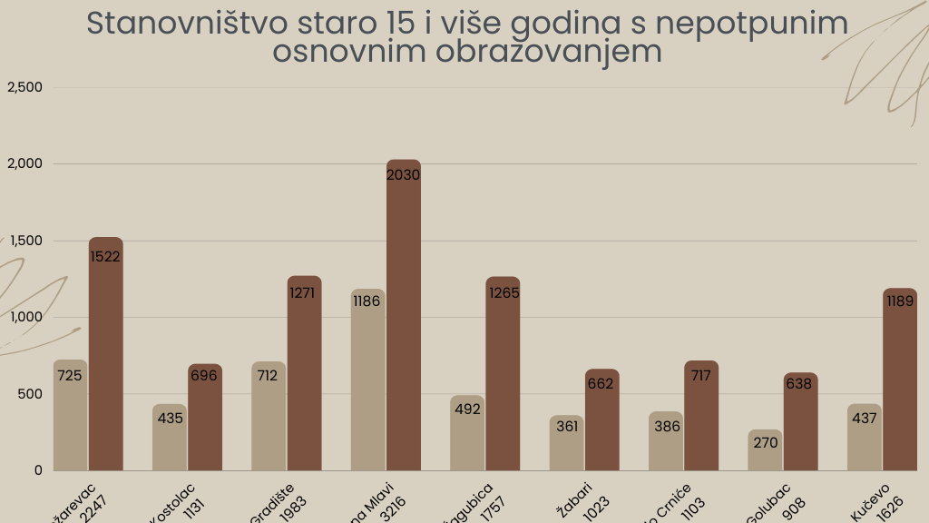Ista situacija je u svim opštinama Braničevskog okruga. Jedino je u Petrovcu na Mlavi razlika u broju muškaraca i žena bez školske spreme minimalna.
