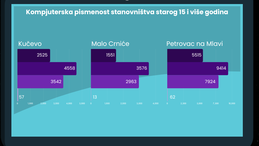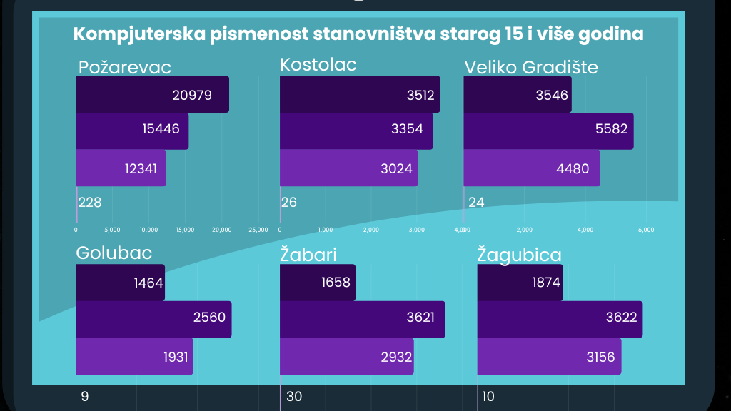 Među opštinama u Braničevskom okrugu, samo Požarevac i Kostolac imaju najveći udeo stanovništva starog 15 godina i više koje je kompjuterski pismeno. U svim ostalim opštinama Braničevskog okruga najveći udeo stanovništva delimično poznaje rad na računaru.