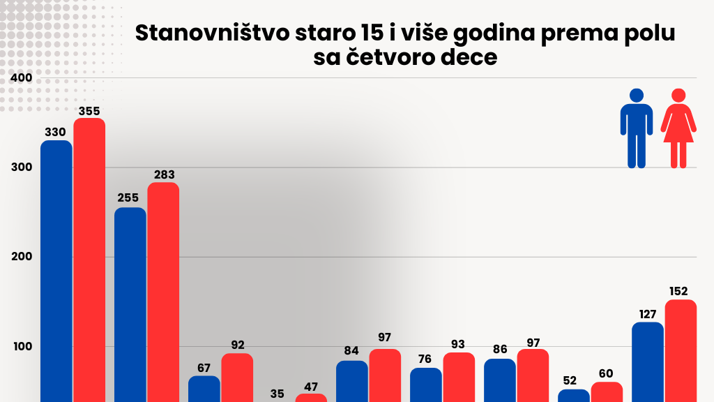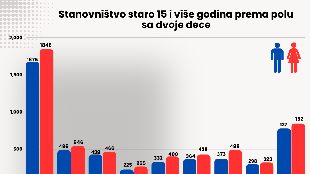 Rezultati Popisa 2022. pokazuju da su primetne značajne razlike u broju živorođene dece između muškaraca i žena u Srbiji. Kod muškaraca je skoro izjednačen udeo lica bez dece i sa dva deteta (oko 36%), slede muškarci sa jednim biološkim detetom (16,2%) i sa troje dece (8,2%). Kod žena starosti 15 i više godina najveći udeo imaju žene koje su rodile dvoje dece (42,8%), slede žene koje nisu rađale (25,7%), zatim žene sa jednim detetom (19,7%) i žene sa troje živorođene dece (9,1%).