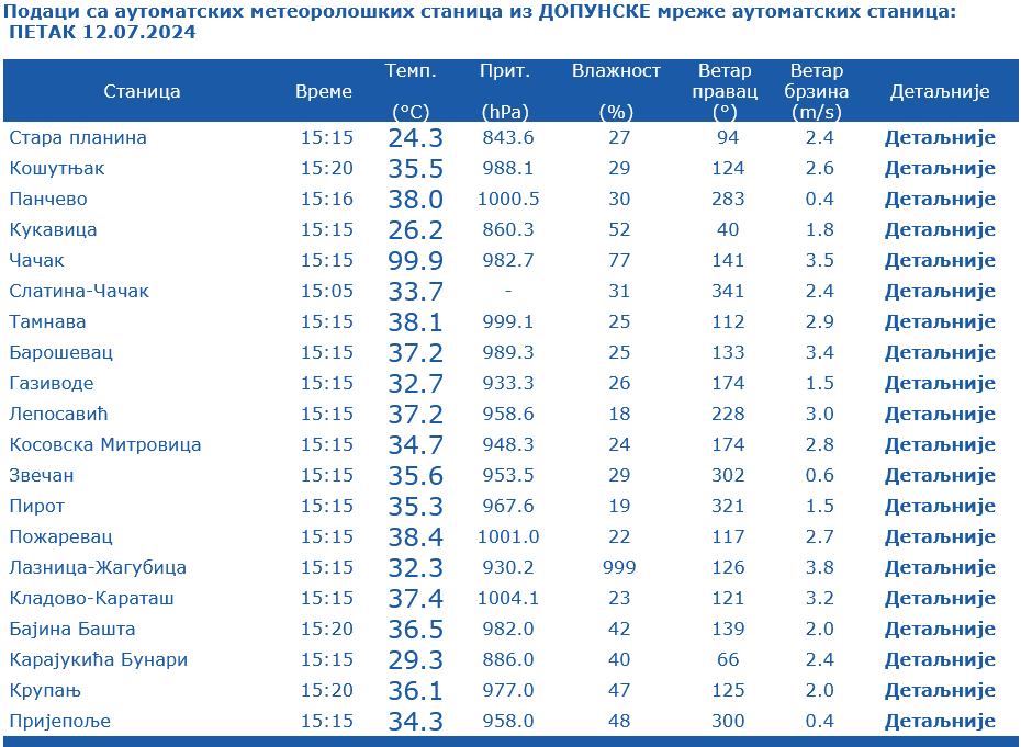 Ispod Požarevca po merenjima našli su se Niš, Leskova, kao i Smederevska Palanka gde je izmereno 38 stepeni.