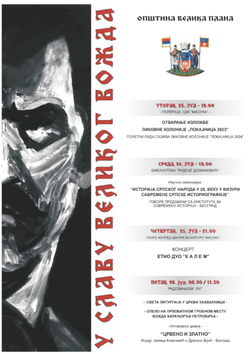 Ovog leta u Velikoj Plani smenjuju se jedan za drugim kulturno-zabavni sadržaji. Posle zatvaranja MAEKS-a, koncerta KUD-ova povodom zatvaranja Letnjeg kampa 2024 i Kafanske večeri na platou ispred CZK „Masuka“, sinoć su počeli Voždovi dani, posvećeni obeležavanju godišnjice Karađorđeve smrti.