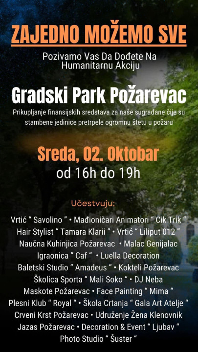 U Gradskom parku, u sredu, 2. oktobra, biće organizovana humanitarna akcija "Zajedno možemo sve". Ova akcija ima za cilj prikupljanje novčanih sredstava za naše sugrađane čije su stambene jedinice pretrpele štetu usled požara.