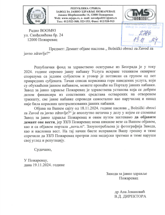 Objava na Vašem sajtu od 18.11.2024. godine naslova „Bolnički obroci za Zavod za javno zdravlje?“ je apsolutno netačna u delu u kojem se spominje Zavod za javno zdravlje Požarevac i ovim putem zahtevamo da objavite demant ove vesti, jer ZZJZ Požarevac nema nikakve veze sa Vašom objavom, kao i sa objavom portala „nova.rs“. Zloupotrebljena je fotografija Zavoda, kao i naslovna vest. Na taj način biste ispravili Vašu grešku i time sprečili da ZZJZ Požarevac pretrpi loš medijski tretman i time naruši svoj ugled i reputaciju.“