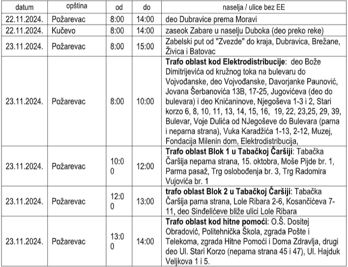 Zbog toga će bez električne energije biti korisnici na sledećim lokacijama: