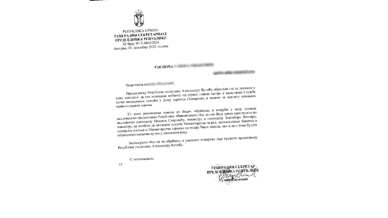 Uputila je zvaničnu žalbu i obratila se i državnim institucijama, uključujući državnog sekretara Aleksandra Stefovskog, koji je obećao da će predmet preneti ministru zdravlja Zlatiboru Lončaru. Nakon toga obratila sam se i kabinetu predsednika Srbije i dobila odgovor da je zahtev prosleđen Ministarstvu zdravlja i Ministarstvu za rad, socijalna i boračka pitanja.