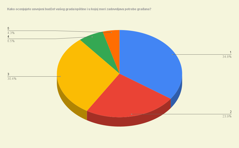 Na pitanje "Kako ocenjujete usvojeni budžet vašeg grada/opštine i u kojoj meri zadovoljava potrebe građana?", najviše građana dalo je niske ocene. Ocenu 1 dalo je 16 ispitanika, ocenu 2 – 11, a ocenu 3 – 14. Ocene 4 i 5 dobilo je svega 3, odnosno 2 ispitanika. Prosečna ocena budžeta iznosi 2,2, što ukazuje na visok stepen nezadovoljstva građana trenutnim finansijskim planovima.
