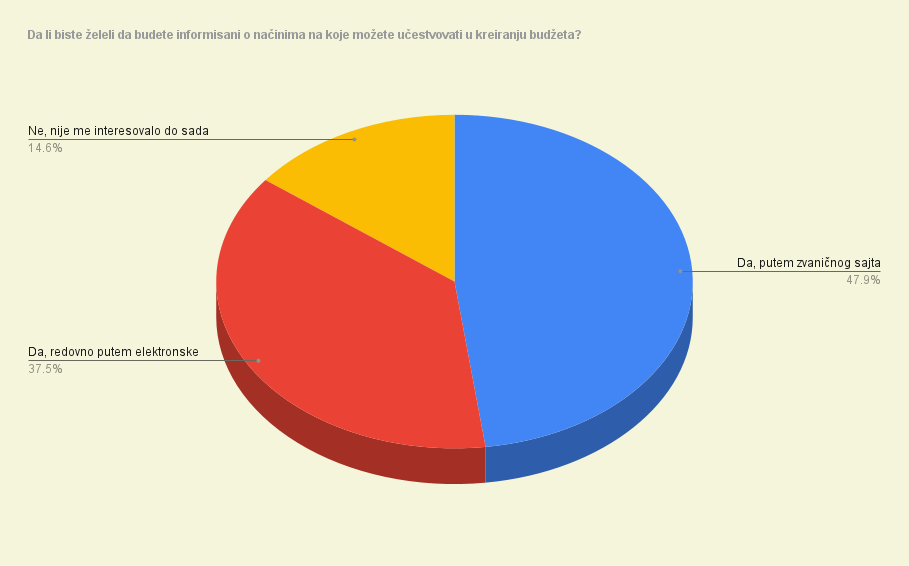 Na temu informisanja o mogućnostima učešća u budžetskom procesu, 23 ispitanika izrazilo je želju za informacijama putem zvaničnog sajta opštine ili društvenih mreža, dok bi 18 preferiralo obaveštenja putem e-maila ili SMS-a. Sedam ispitanika izjavilo je da ih ova tema ne zanima. Sajtovi opština su i sada najčešći izvori informisanja, a možda bi trebalo razmisliti i o podeli određenih sadržaja na društvenim mrežama, kako bi što više građana bilo uključeno u procese donošenja odluka.