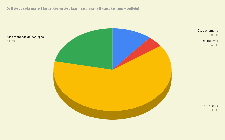 Što se tiče dosadašnjeg učešća u budžetskim procesima, većina (29) nikada nije učestvovala u javnim raspravama, dok 10 ispitanika nije ni znalo da ta mogućnost postoji. Samo petoro ispitanika povremeno učestvuje, a dvoje redovno.