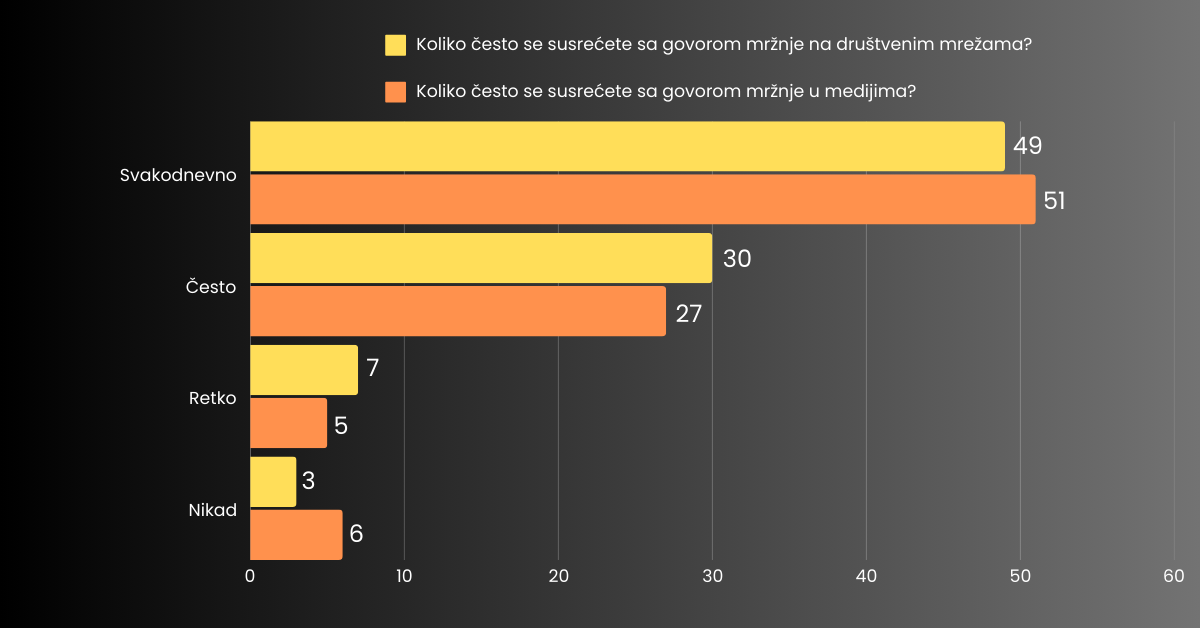 Vrlo mali broj anketiranih se sa govorom mržnje, bilo u medijima, bilo na društvenim mrežama, nije susreo nikada ili se susreće retko.