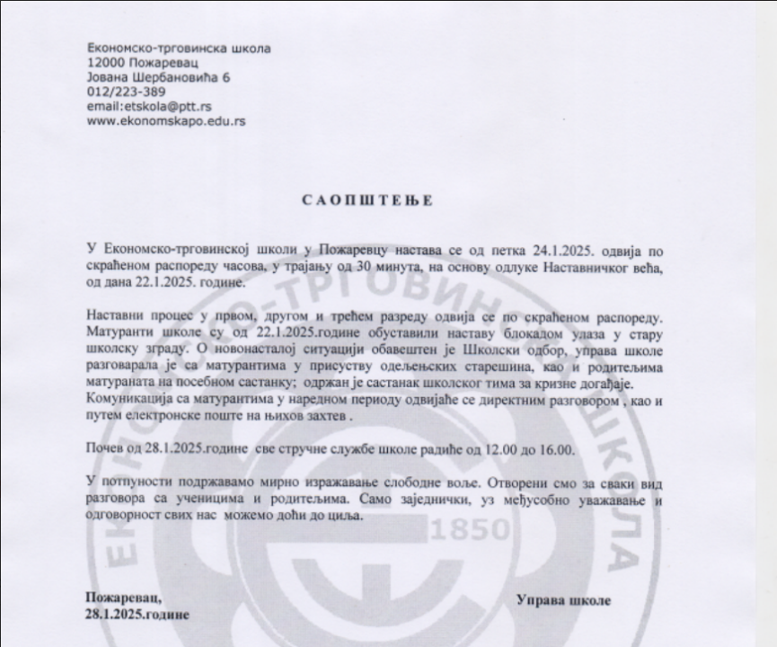 Uprava Ekonomsko-trgovinske škole prosledila je našoj redakciji saopštenje u kome navode kako škola funkcioniše prethodnih dana.