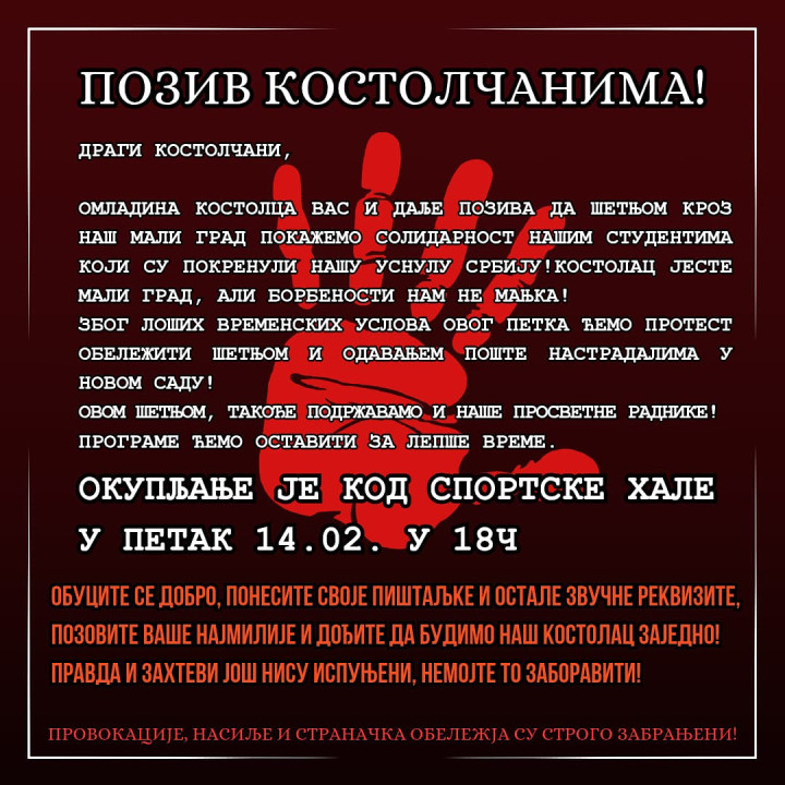 Takođe, sutra 14. februara biće organizovana šetnja solidarnosti pred odlazak u Кragujevac.