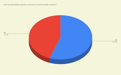 Rezultati ankete “Mesne zajednice i njihova uloga – Šta građani misle?” pokazuju da je podeljeno mišljenje kada je reč o (eventualnom) izlasku na izbore za savete mesnih zajednica. Takođe, među građanima postoji izraženo nepoverenje u rad saveta mesnih zajednica, kao i nizak nivo informisanosti i učešća u njihovom radu.