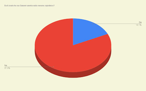 Sa druge strane, samo 13 ispitanika, odnosno 18%, zna ko su članovi saveta njihove mesne zajednice. Ovaj podatak jasno ukazuje na nedovoljnu vidljivost i angažovanje saveta u komunikaciji sa građanima, što može doprineti smanjenom poverenju i manjku učešća građana u radu mesnih zajednica.