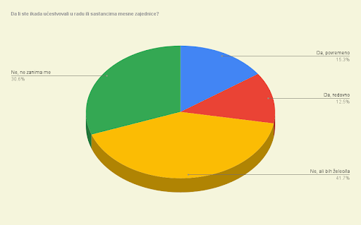 Nešto manje od trećine građana redovno ili povremeno učestvuje u radu ili sastancima mesnih zajednica. Ipak, postoji potencijal za povećanje građanskog angažmana, s obzirom na to da značajan broj ljudi izražava želju da se uključi, ali verovatno ne zna na koji način ili nema dovoljno motivacije zbog trenutnog stanja u mesnim zajednicama.