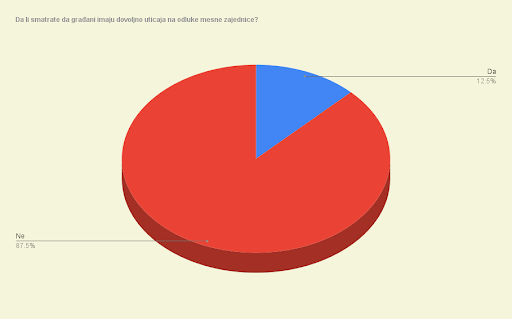 Na pitanje "Da li smatrate da građani imaju dovoljno uticaja na odluke mesne zajednice?", samo 9 ispitanika odgovorilo je sa "Da", dok ih je čak 63 reklo "Ne". Ovaj rezultat dodatno potvrđuje da građani osećaju isključenost iz odlučivanja i percepciju da saveti mesnih zajednica ne rade u njihovom najboljem interesu.