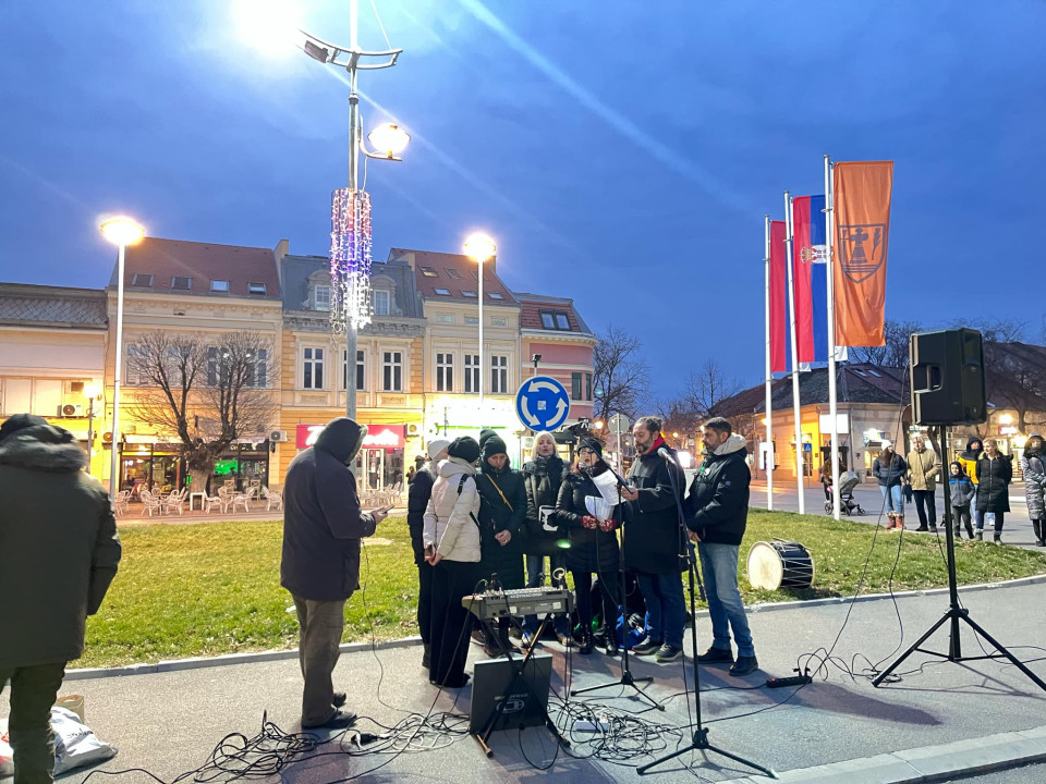 Građani su zajedno sa pojedinim muzičkim izvođačima iz grada izveli Bože pravde i pesme Za milion godina i ovo je zemlja za nas.