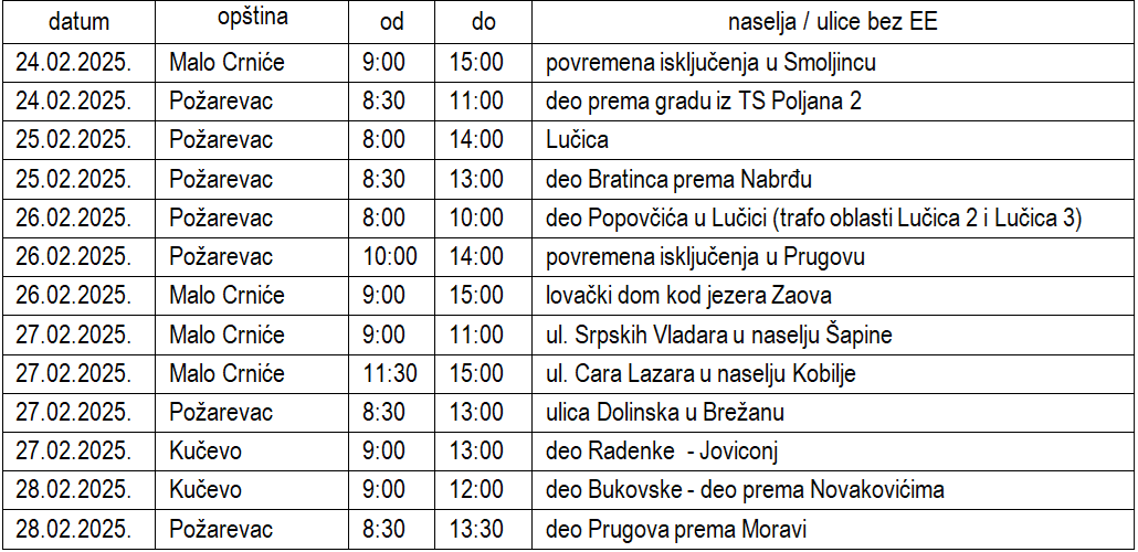Isključenja struje od 24. do 28. februara