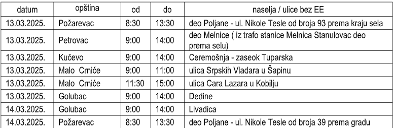 Ogranak Elektrodistribucija Požarevac izvodiće radove na redovnom održavanju ili rekonstrukciji distributivne elektroenergetske mreže i trafo stanica radi unapređenja kvaliteta napajanja električnom energijom i seči rastinja u trasi dalekovoda ili niskonaponske mreže.
