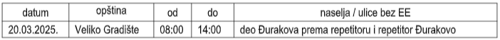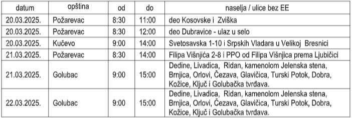 Ogranak Elektrodistribucija Požarevac izvodiće radove na redovnom održavanju ili rekonstrukciji distributivne elektroenergetske mreže i trafo stanica radi unapređenja kvaliteta napajanja električnom energijom i seči rastinja u trasi dalekovoda ili niskonaponske mreže. Zbog toga će bez električne energije biti korisnici na sledećim lokacijama:
