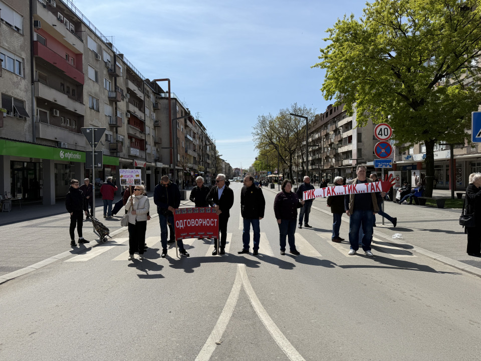 Okupljeni su na 16 minuta blokirali pešački prelaz u Tabačkoj čaršiji na ulazu u kružni tok.