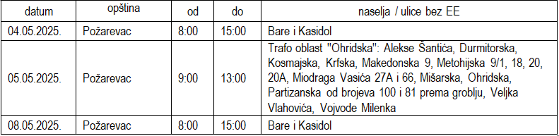 Zbog toga će bez električne energije biti korisnici na sledećim lokacijama: