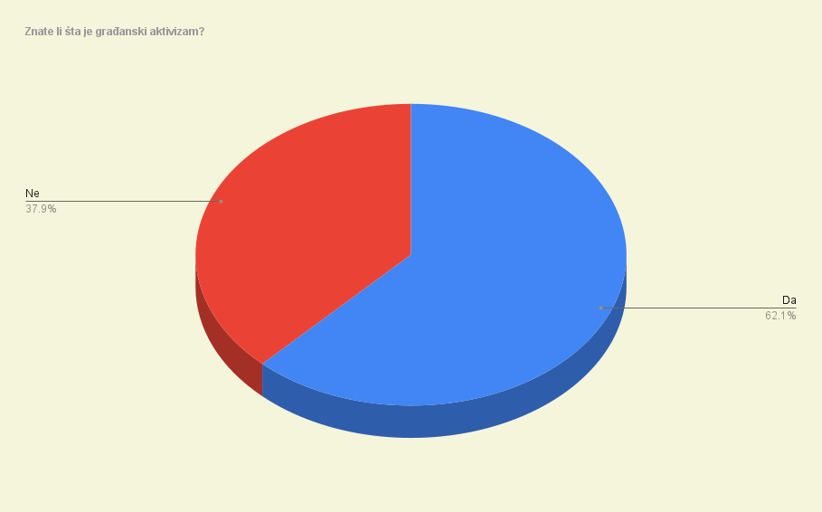 Na pitanje „Da li znate šta je građanski aktivizam?“, gotovo dve trećine ispitanika (41 od 66) odgovorilo je potvrdno, dok ostali priznaju da nisu sigurni u značenje ovog pojma. Međutim, pojedinačni odgovori u kojima su čitaoci svojim rečima opisivali ovaj termin pokazuju da ga povezuju sa lokalnim angažmanom, rešavanjem problema u zajednici, donošnjem odluka i akcijama za opšte dobro.