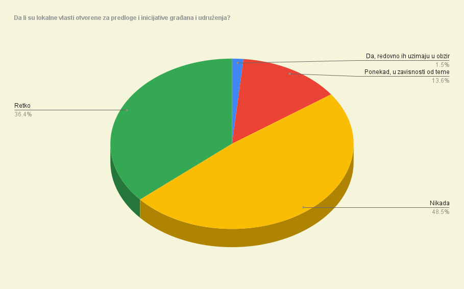 Poverenje u lokalnu vlast je, međutim, veoma nisko. Na pitanje „Da li lokalna vlast podržava udruživanje građana i civilno društvo?“, ogromna većina (čak 56 ispitanika) smatra da vlast to obeshrabruje, dok samo devetoro primećuje neki vid podrške. Sličan trend zabeležen je i u odgovoru na pitanje „Da li su lokalne vlasti otvorene za inicijative građana?“ – gde najveći broj ispitanika smatra da vlast nikada ili vrlo retko uvažava predloge.