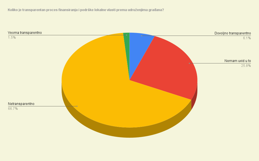 Kada je reč o podršci različitim sferama društvenog života, najviše građana smatra da vlast zapravo ne podržava nijednu posebno (41), dok sport vodi među onima koji vide neku vrstu podsticaja. Transparentnost finansiranja i podrške udruženjima ocenjena je pretežno kao niska – 44 ispitanika smatra da je proces netransparentan, dok ih sedamnaestoro kaže da nemaju uvid u te procese.