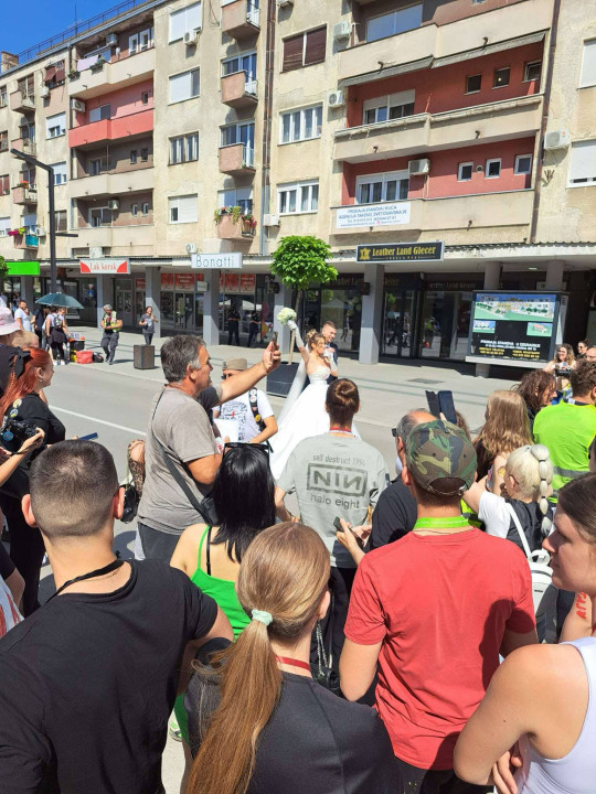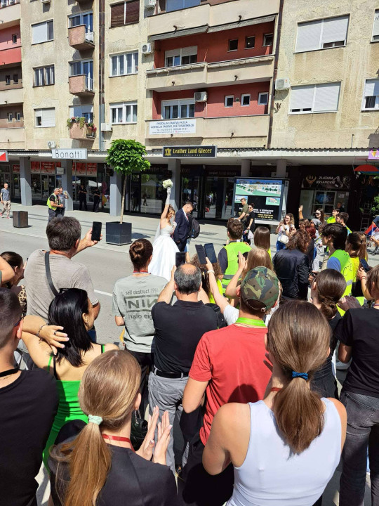 Učesnike protesta pozdravili su i tek venčani mlada i mladoženja.