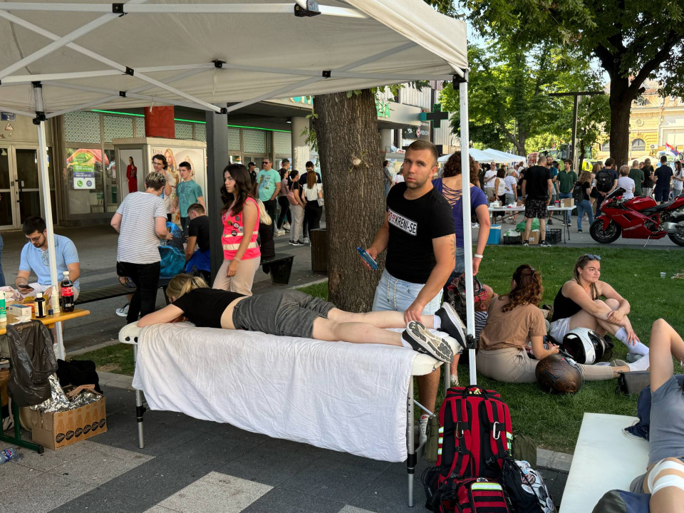 Fizioterapeuti iz Požarevca pridružili su se medicinskom štandu i na taj način dali podršku studentima. Masiraju one koji imaju bolove u nogama od šetnje i trčanja.