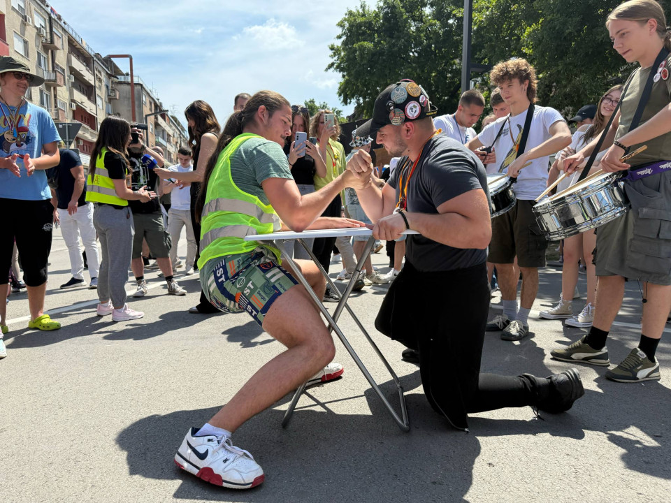 Jedna od aktivnosti današnjeg protesta jeste i obaranje ruku. Kako je objasnila studentkinja iz Požarevca, ova aktivnost je simbolična. Naime, navela je da je najveći problem sa kojim su se susreli prilikom organizovanja ovog protesta bio smeštaj šetača i trkača. Podsetila je da su se studenti Požarevca pre 20 dana odneli dopis Sportskom centru i tražili smeštaj, na šta su dobili usmeni potvrdni odgovor. Ipak, nekoliko dana pred protest iz Sportskog centra im je rečeno da ne mogu dobiti smeštaj zbog prvenstva u obaranju ruku.