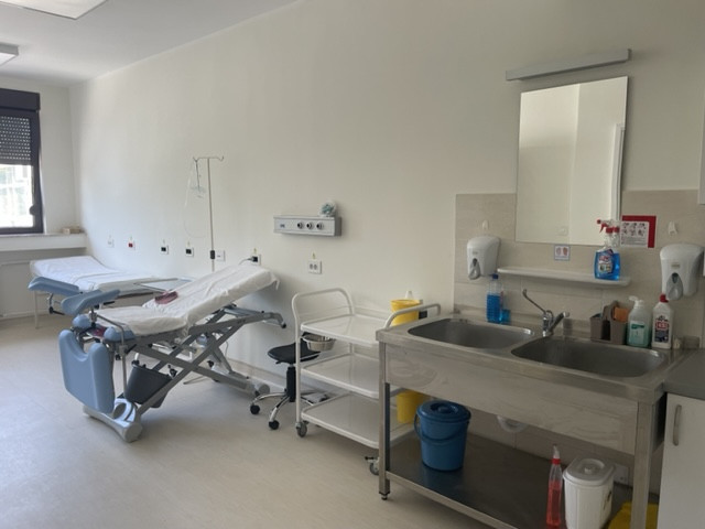 Na prvom spratu zgrade nalazi se odeljenje ginekologije sa neonatologijom, a trudnice koje se od naredne nedelje budu našle na ovom odeljenju biće u sobama koje imaju najviše četiri kreveta, dok svaka soba ima zasebno kupatilo. Porođajne sale i boksevi za bebe takođe se nalaze na ovom spratu.