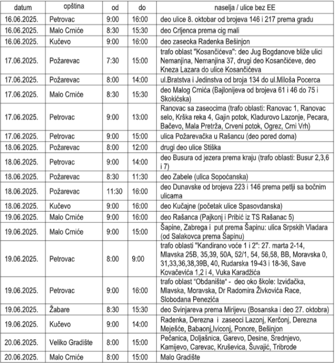 Ogranak Elektrodistribucija Požarevac izvodiće radove na redovnom održavanju ili rekonstrukciji distributivne elektroenergetske mreže i trafo-stanica radi unapređenja kvaliteta napajanja električnom energijom i seči rastinja u trasi dalekovoda ili niskonaponske mreže.