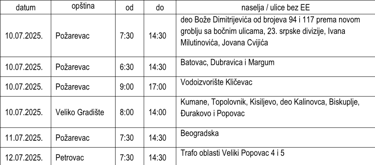 Isključenja struje 10. i 11. jula