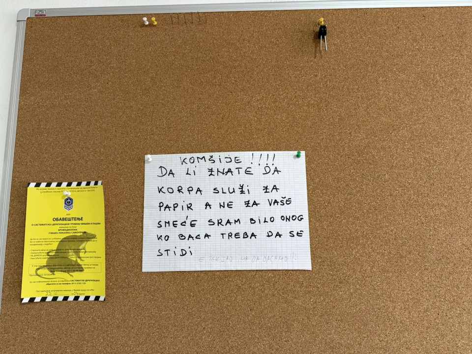 Na oglasnoj tabli u ulazu jedne zgrade pojavila se prvo poruka za stanare koji bacaju smeće u kantu za flajere, a nekoliko dana kasnije i odgovor.