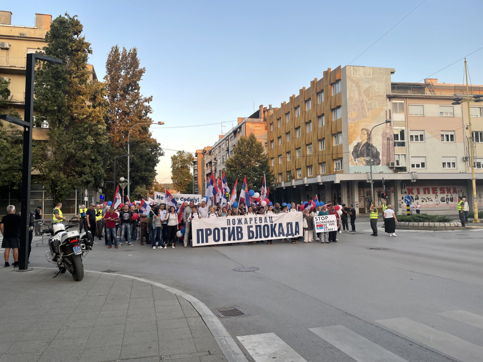 Pristalice su se okupile ispred prostorija Srpske napredne stranke u Požarevcu i odatle krenuli u protestnu šetnju do kružnog toka kod Višeg suda.