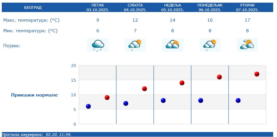 Vremenska prognoza izgleda tako da bi grejanje trebalo da počne odmah, ukoliko se prate zakonski uslovi prema kojima prevremeni početak grejanja može biti ukoliko tri dana zaredom temperatura u 21 čas bude 12 stepeni ili niža. Prema trenutno dostupnim prognozama, najviša dnevna temperatura u naredna tri dana iznosiće svega 12, 14 i 16 stepeni, dok će se noćne temperature spuštati i do 6 stepeni.